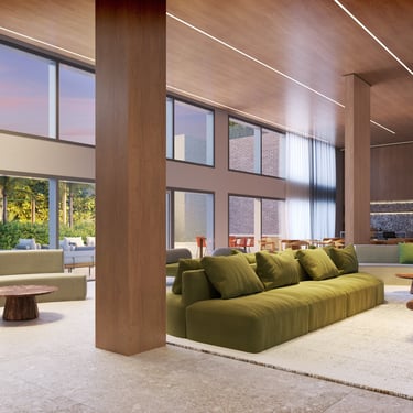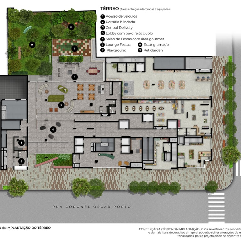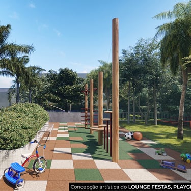 No Térreo: Lobby, Central delivery, Salão de festas com área gourmet, Lounge de festas com estar gramado, Playground e Pet garden.