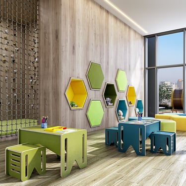 Lazer elevado no 6º pavimento com, Brinquedoteca, Playground, Belvedere pub com churrasqueira, Fitness, Espaço funcional, Piscina adulto e infantil, Solarium.