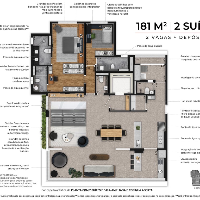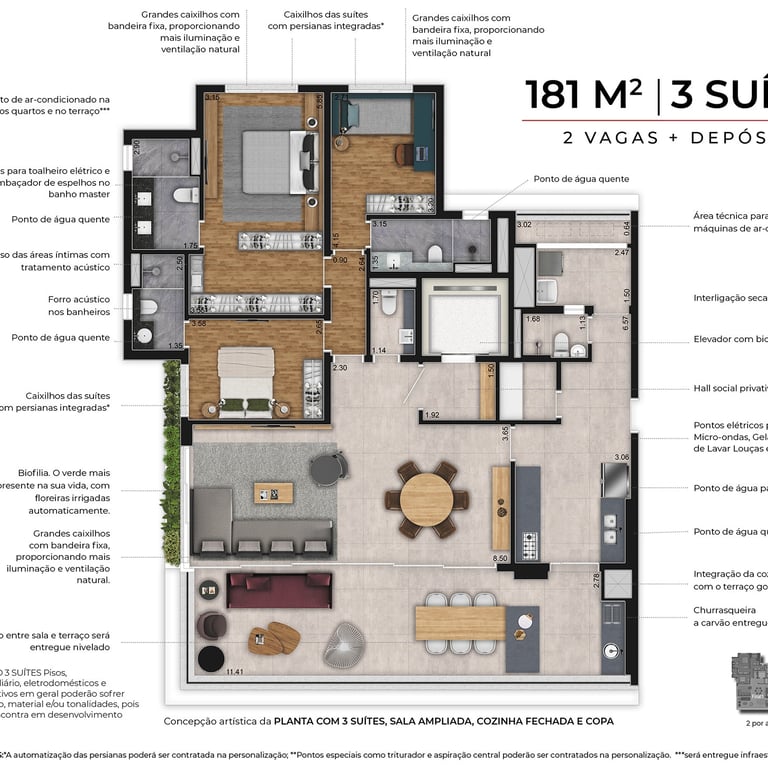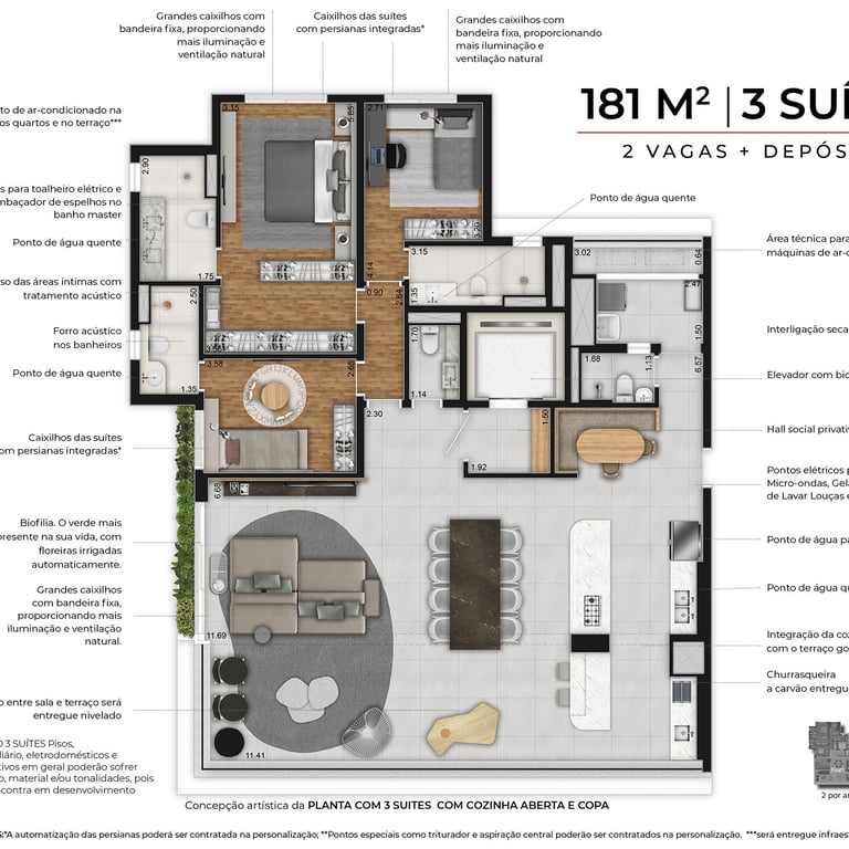 Apartamentos de 181m², com 3 suítes, depósito privativo e 2 vagas (um ponto por unidade de carregador para mobilidade elétrica de automóveis)