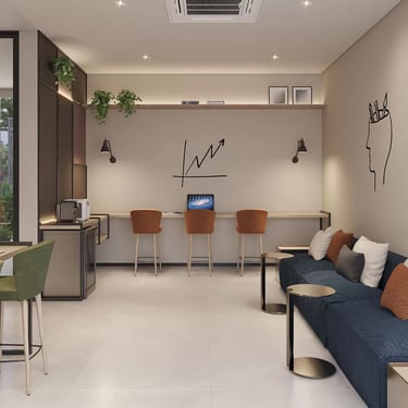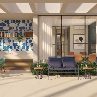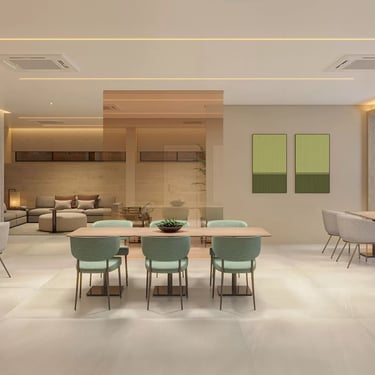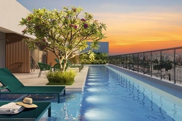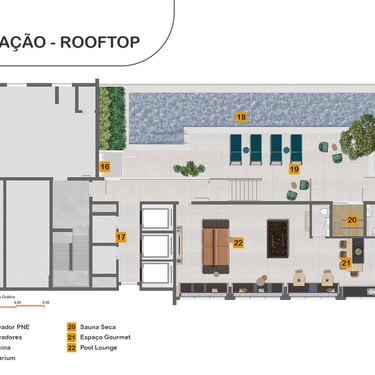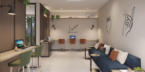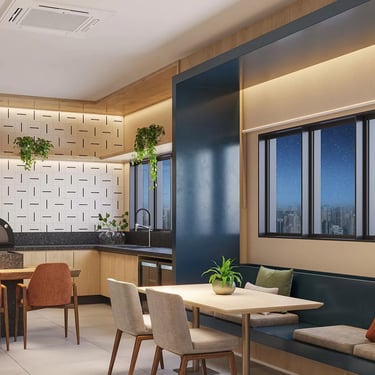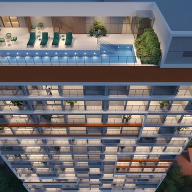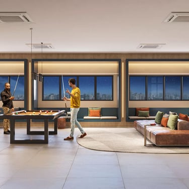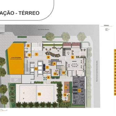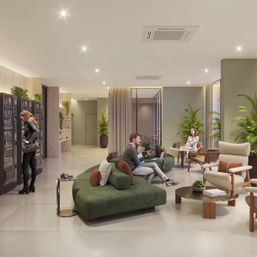 Térreo: Lobby Lounge, Mercado de uso interno, Coworking, Sala de reuniões, Phone Booth, Brinquedoteca, Fitness, Salão de Festas, Delivery, Guarita Blindada